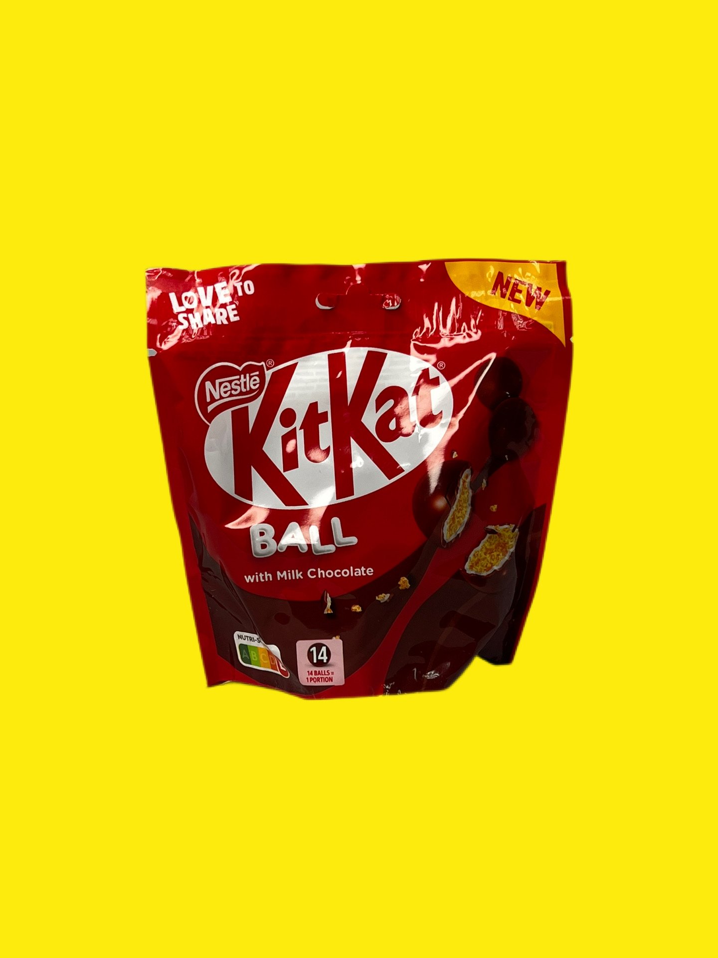 KitKat Ball Молочний Шоколад: Класичні кульки з молочного шоколаду (близько 39,6%) з хрусткою зерновою або вафельною серцевиною. Мають ніжну текстуру, що тане в роті, та впізнаваний смак батончика KitKat.