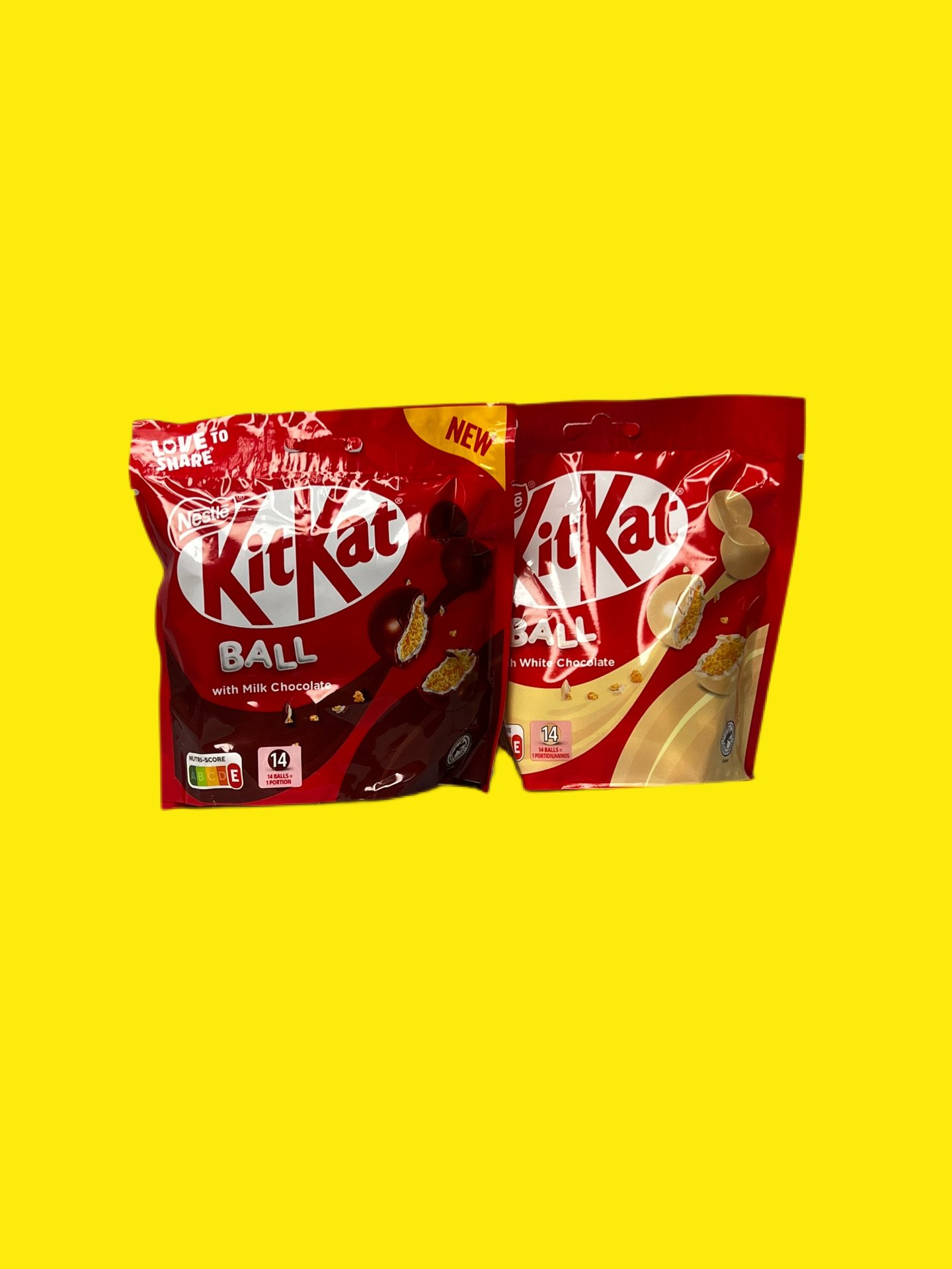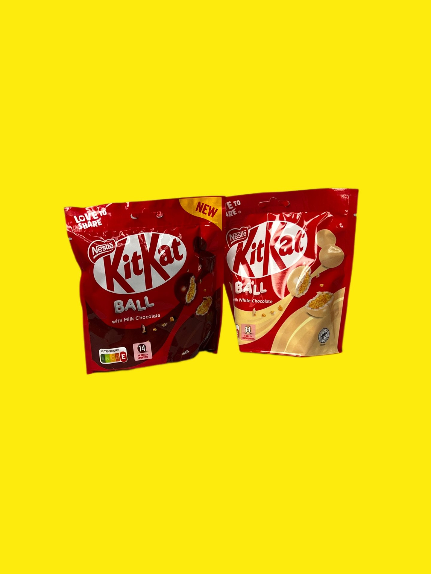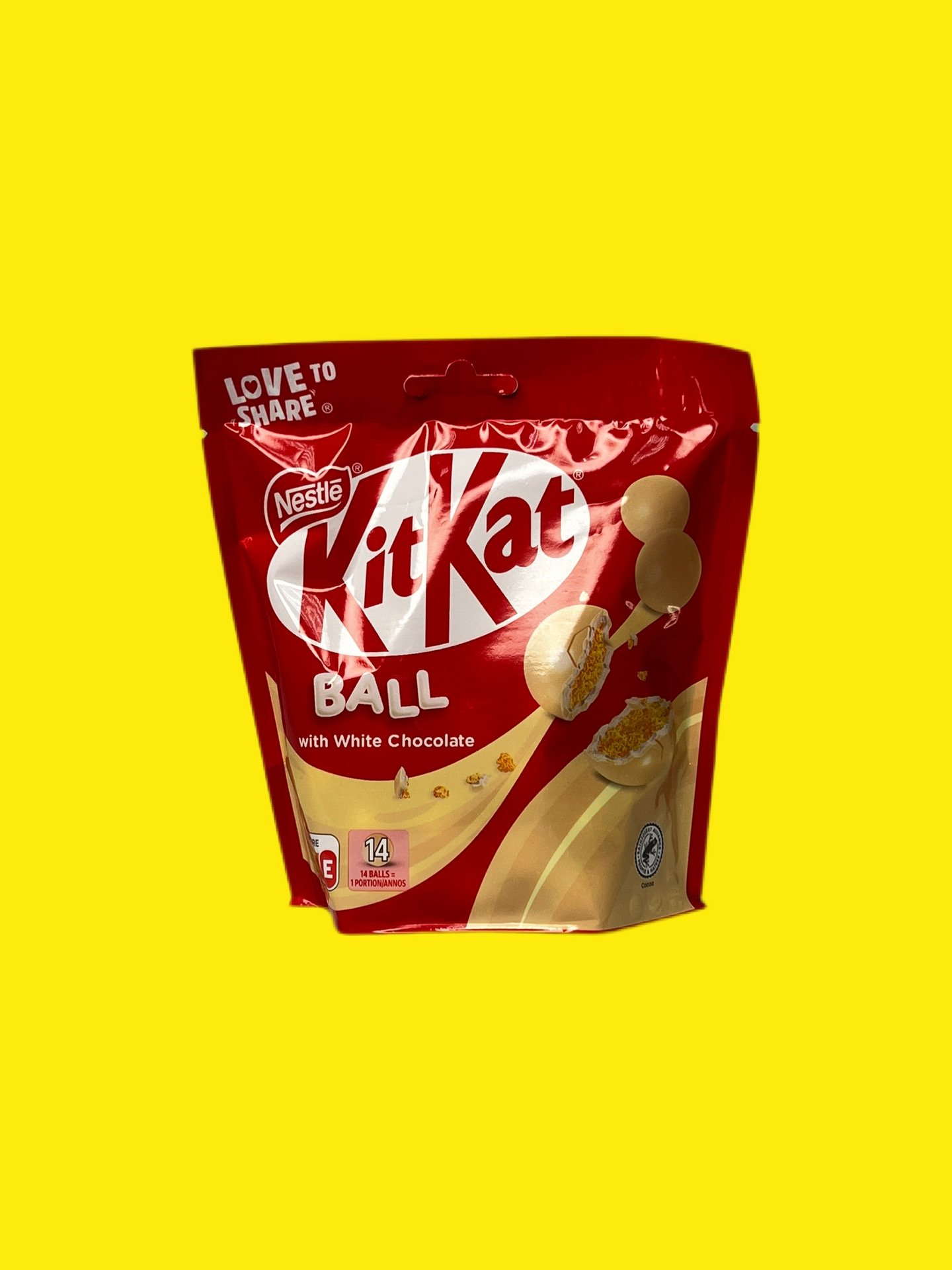 KitKat Ball Білий Шоколад: Хрусткі кульки, вкриті вершковим білим шоколадом. Відрізняються більш вираженим молочно-кремовим смаком. Виготовляються з використанням какао, сертифікованого Rainforest Alliance.