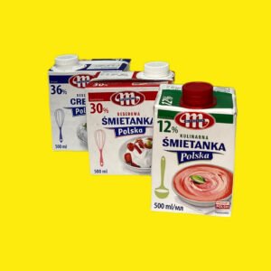 Вершки Smietanka Polska від бренду Mlekovita — це натуральний продукт із насиченим молочним смаком і оптимальною жирністю 36%. Чудово підходять для збивання, приготування десертів, кремів, мусів і соусів.