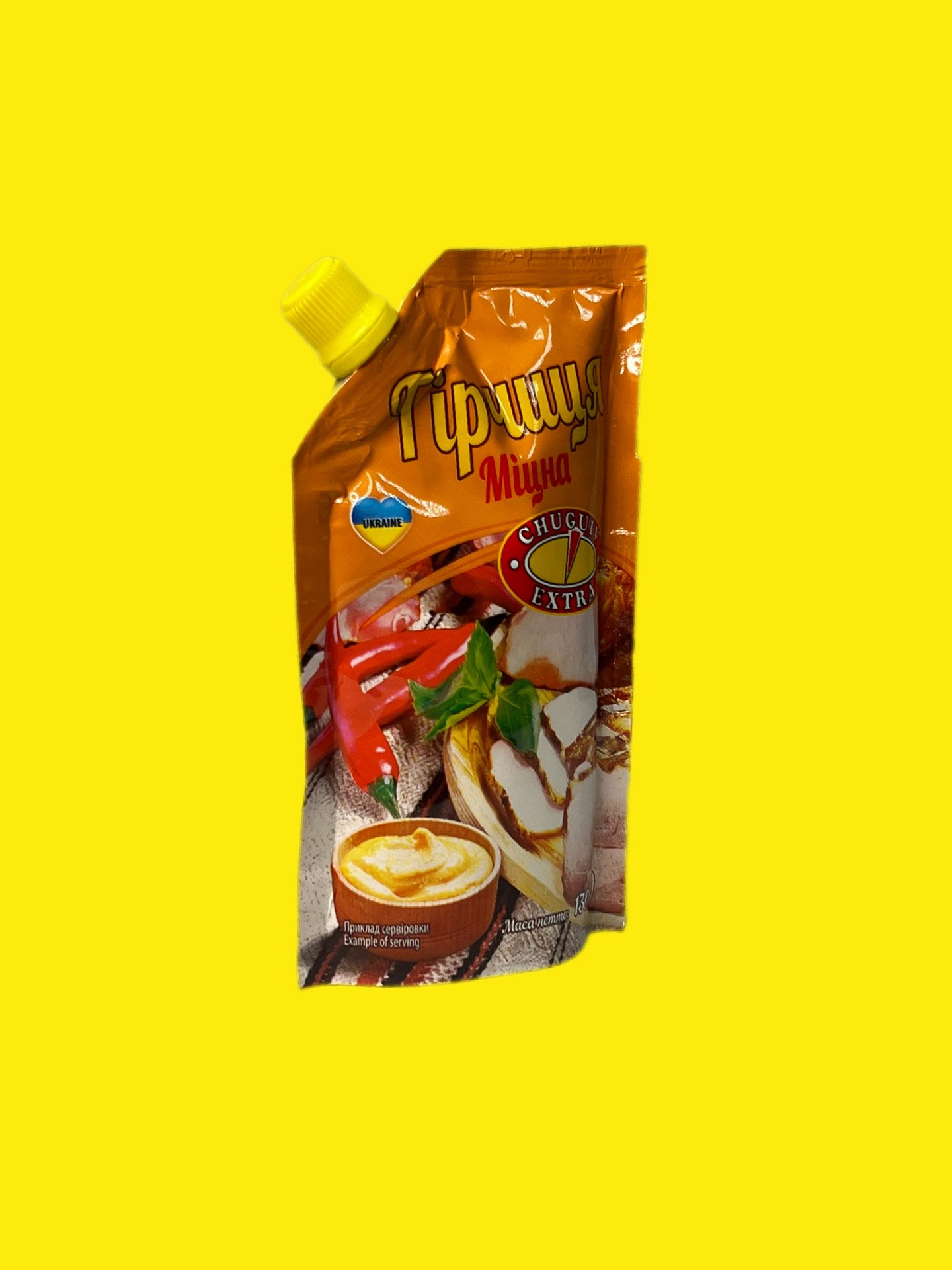 Гірчиця “Міцна” від Чугуїв Продукт (130 г, дой-пак) — це класична пекуча приправа, виготовлена з мелених зерен жовтої гірчиці (24%) та солі «Екстра».