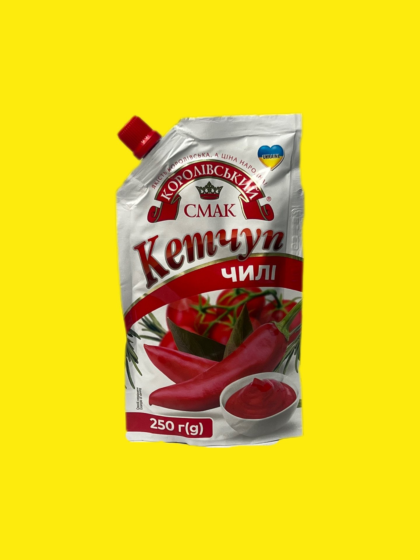 Кетчуп «Чилі» від ТМ «Королівський Смак» — це гострий томатний соус у зручній упаковці дой-пак з дозатором, створений для любителів пікантних страв. Він має густу однорідну консистенцію, яскравий аромат спецій та насичений пекучий смак завдяки екстракту перцю чилі.