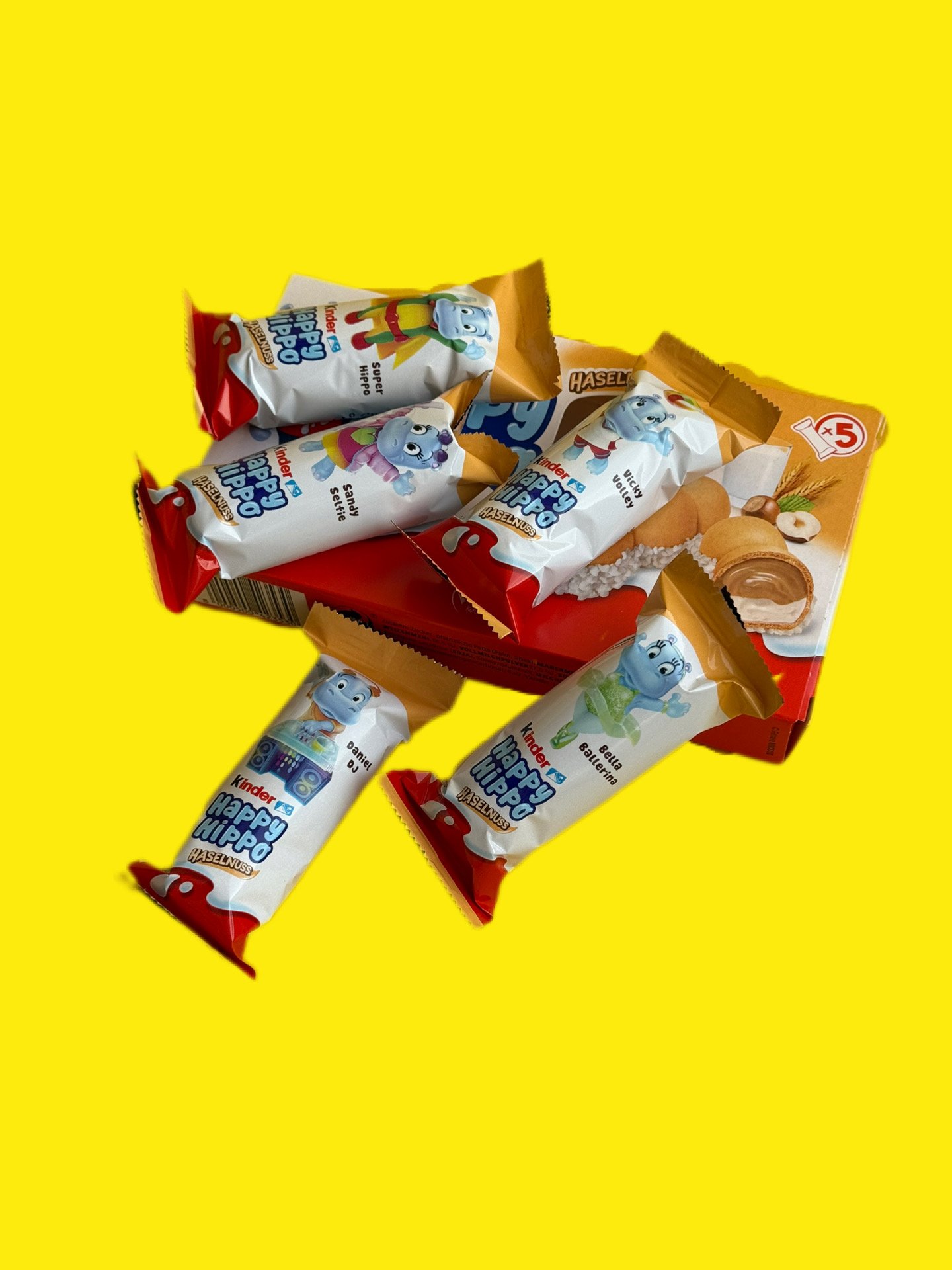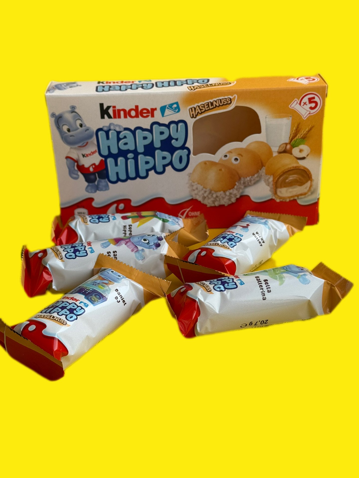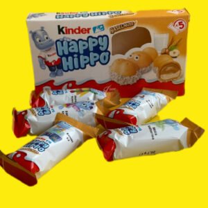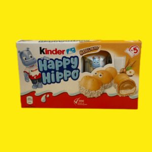Kinder Happy Hippo — набір із 5 мініатюрних батончиків у формі бегемотів. Зовнішня оболонка являє собою хрусту вафлю, обсипану дрібною крихтою білого шоколаду — вона створює ілюзію, ніби бегемотики плавають у воді. Усередині печиво заповнене ніжним вершково-горіховим кремом, який миттєво тане в роті. Ласощі приготовані без використання штучних барвників і консервантів, не містять гідрогенізованих жирів. Це робить його абсолютно безпечним для діток. Для збереження свіжості кожен батончик Кіндер Хеппі Хіпо поміщений в індивідуальне паковання. Це смачний і ситний перекус у дорозі, у школі або вдома за чашкою гарячого чаю, який потішить навіть найвимогливіших ласунів.
