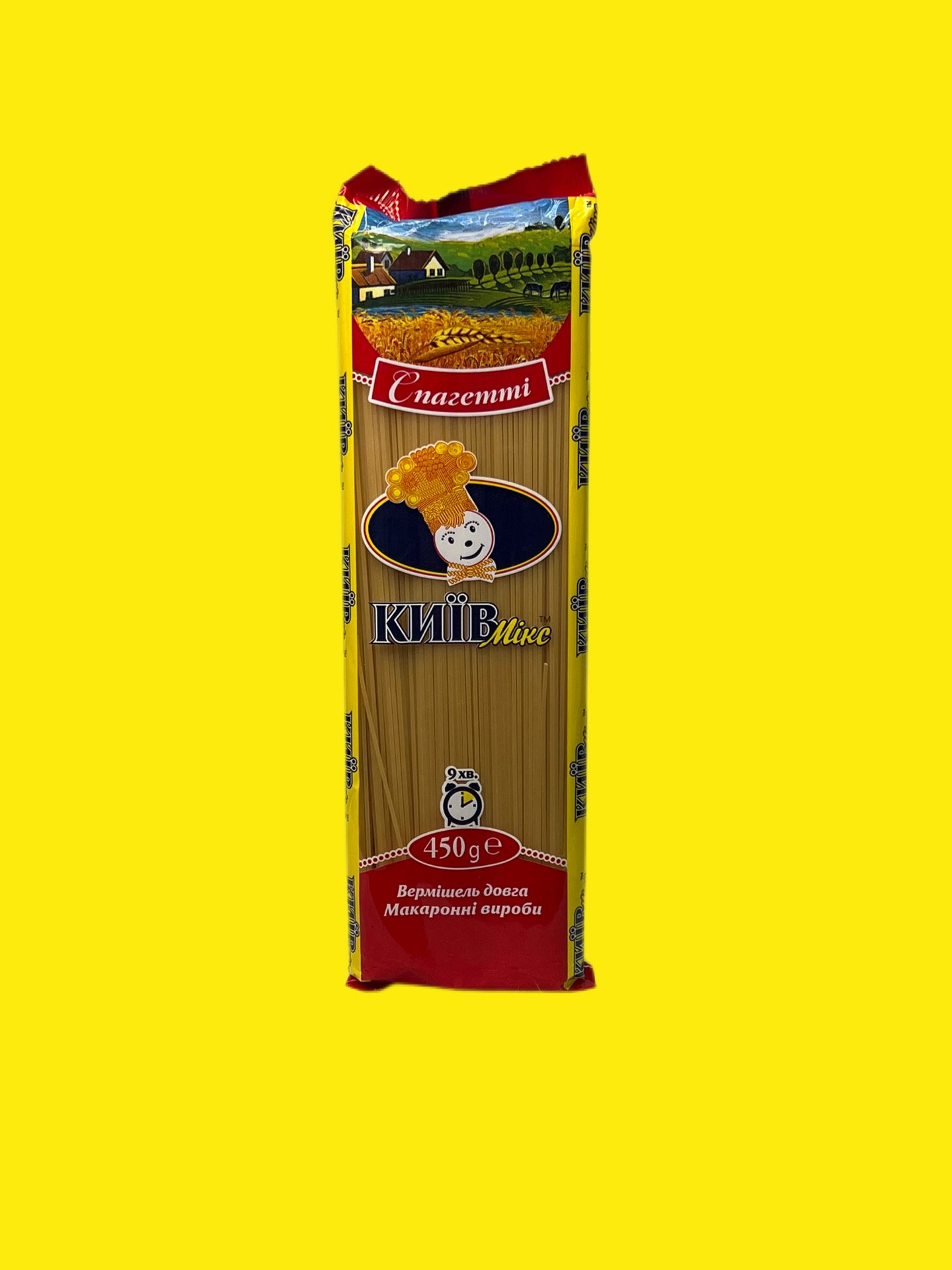 Макарони «Київ Мікс» Спагетті — це класичні довгі макаронні вироби (група Б, клас Екстра), виготовлені з борошна м’якої склоподібної пшениці вищого гатунку та питної води.