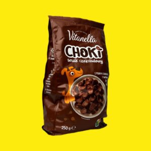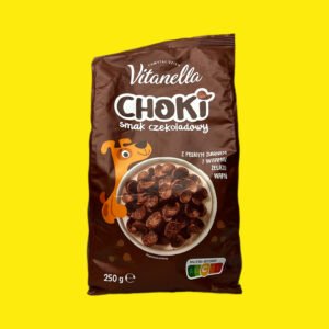 Сухий сніданок Вітанелла Чокі — це польські шоколадні злакові пластівці, створені для швидкого та поживного сніданку. Виготовлені з цільнозернового пшеничного борошна з додаванням какао, вони збагачені 7 вітамінами, залізом та кальцієм. Не містять штучних ароматизаторів, чудово смакують з молоком, йогуртом або як окремий хрусткий перекус.
