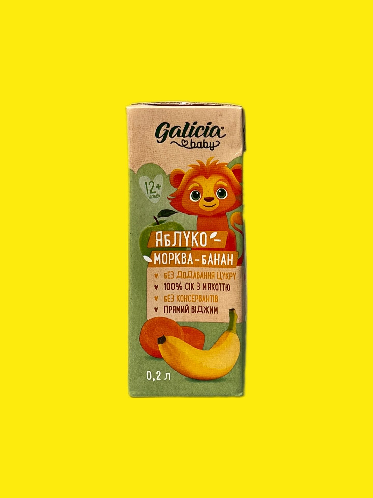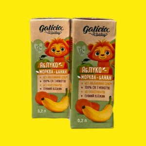 Сік Галиція Бебі — це натуральний, стерилізований та гомогенізований продукт з м’якоттю, розроблений для дітей від 12 місяців. Склад продукту прямим віджимом містить лише натуральні пюре та соки (65% яблуко, 22,5% яблучне пюре, 8% морква, 4,5% банан), без цукру, води чи консервантів.