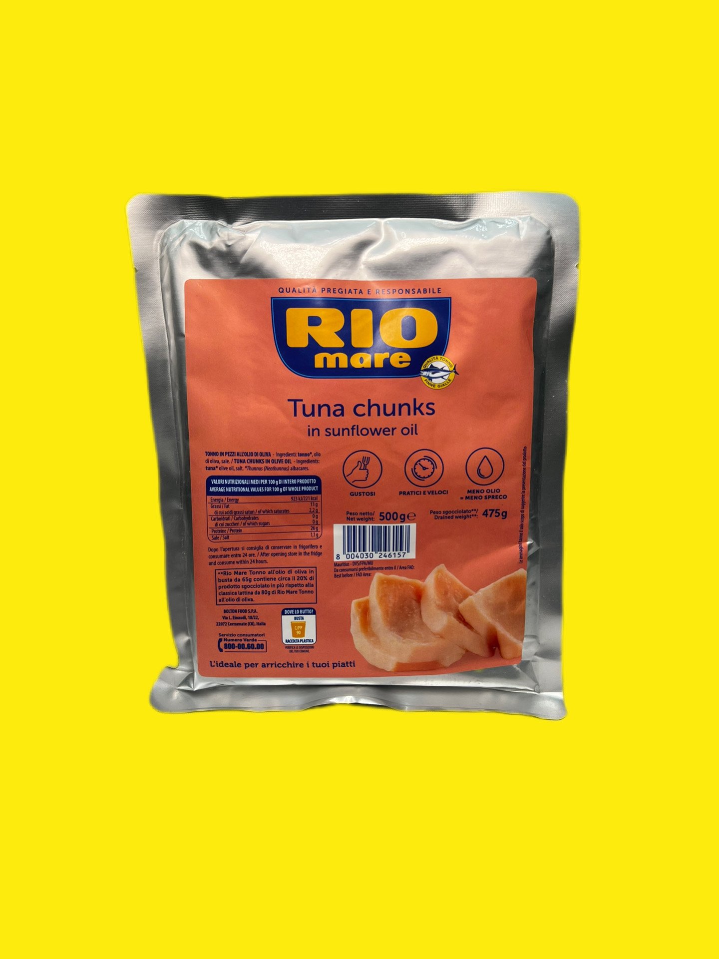 Rio Mare Тунець у соняшниковій олії 500 г — один із найпопулярніших варіантів консервованого тунця преміального класу. Компанія Rio Mare славиться добором якісного філе та дбайливою технологією виробництва, яка дозволяє зберегти природний смак риби. Великі, цільні шматочки тунця мають щільну структуру, приємний аромат і збалансовану соковитість завдяки соняшниковій олії.