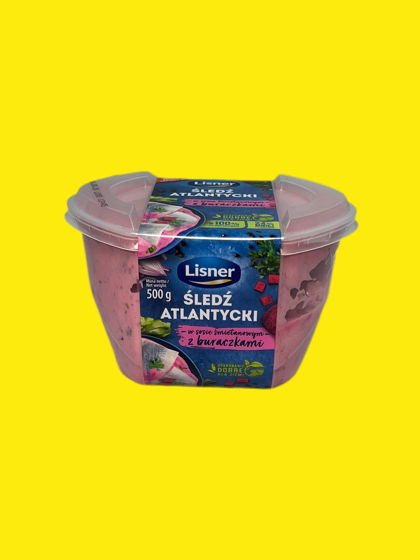 Оселедець з червоним Буряком Lisner – Філе Атланичного оселедця без цибулі, розрізане поздовж філе в сметановому соусі з штаточками червоних Бурячків.