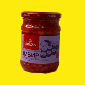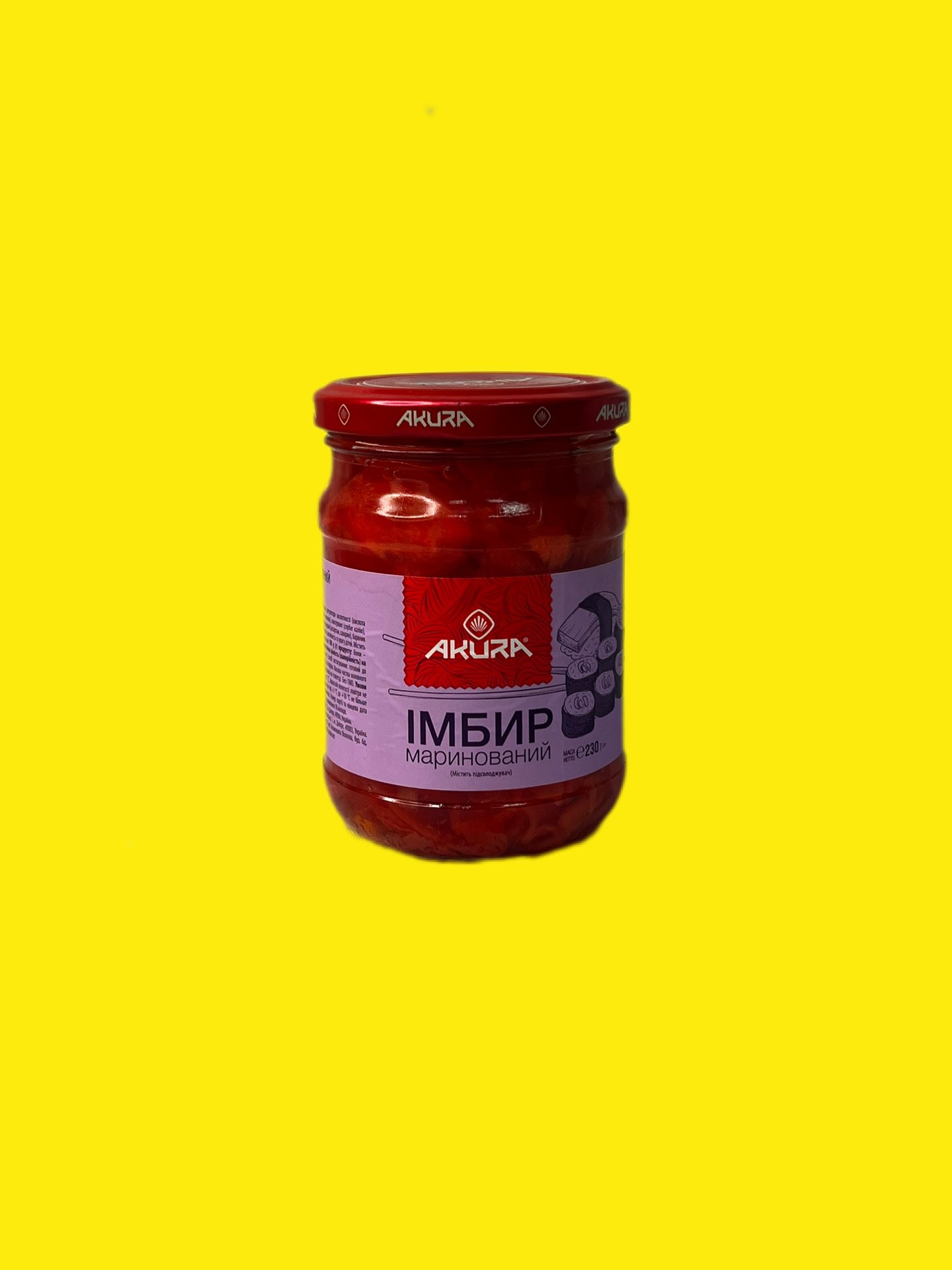 Маринований імбир «Акура» — це тонко нарізані скибочки молодого імбиру рожевого кольору, призначені для суші, ролів, сашимі та овочевих страв. Має пікантний, пряний смак із кисло-солодким балансом, що освіжає рецептори.